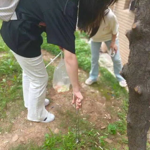 下午一点半,志愿者们手持夹子、垃圾袋等工具迅速投入工作。在宿舍楼周边,志愿者们弯腰捡拾地上的纸屑、塑料包装等,不放过任何一处垃圾;在绿化带中,志愿者们小心翼翼地拔除杂草、捡拾隐藏在草丛里的烟头与塑料垃圾。这一举动既保护了绿植,又让绿化带重现生机,有效改善了宿舍周边卫生环境。