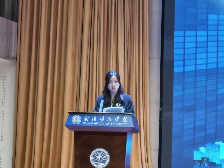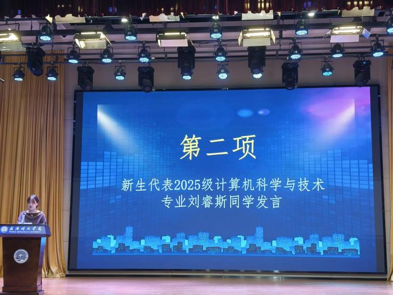 在优秀学长学姐分享结束后,2025 级计算机科学与技术专业新生代表刘睿斯同学紧接着上台发言,她表示,将以优秀的学长学姐为榜样,在未来的大学生活中主动提升专业能力、锤炼综合素养,以踏实的态度打好学习与成长的基础。此外,她还真挚地分享了自己对大学生活的憧憬与向往,传递出新生群体的朝气与期待。