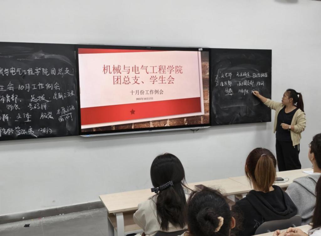 随着纳新工作的结束,学院团总支、学生会的工作步入正轨。为继续推进学院工作顺利开展,2025年10月17日下午,机械与电气工程学院于教一104召开了学院团总支、学生会10月工作例会,总结了9月的工作成效,梳理了常见工作问题,明确了下一阶段学院的工作重点。本次会议由团总支书记李兰芳老师主讲。