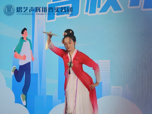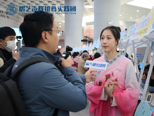 除了精彩的互动游戏,工作站带来的两场特色舞蹈表演更是将现场氛围推向高潮。陈芊宇单人演绎的舞蹈《芍药梦》,舞姿轻盈、意蕴悠长,展现出古典美学的独特韵味;王艺琳等八人带来的民族特色舞蹈《鼓迹》,以凤阳花鼓为核心元素,鼓点铿锵、舞步灵动,将传统民俗文化的活力展现得淋漓尽致,赢得现场阵阵掌声。活动期间,副站长王艺琳还接受了湖北经视记者采访,向媒体与公众分享了工作站推普助力文化传播、服务社会的初心与实践,进一步扩大了活动影响力。