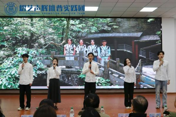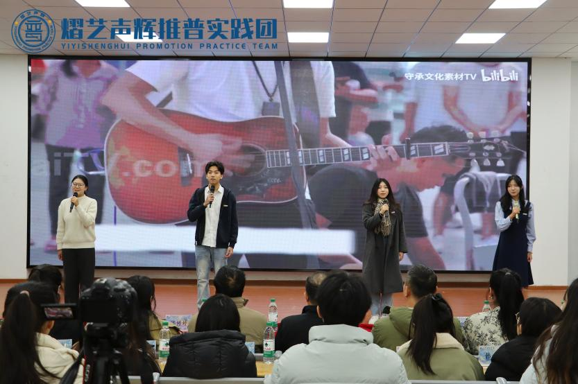仪式在工作站精心制作的纪实短片《语润咸丰,青春筑梦》中拉开序幕。短片生动展现了团队在咸丰县开展普通话推广与实践服务的点点滴滴,记录了团队成员用语言传递温情、以行动助力乡村的青春足迹。这也正是“熠艺声辉”从萌芽到绽放的见证。情景朗诵《蚁族》深情上演,新老队员默契配合,用真挚的语言和饱满的情感,致敬那些在都市中默默奋斗的年轻群体,引发在场观众的深切共鸣。