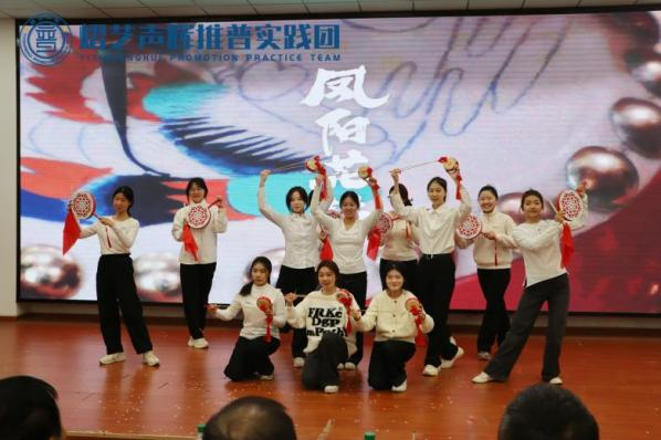 仪式中还呈现了丰富多彩的文化展演。非遗节目《鼓·迹》以凤阳花鼓铿锵的鼓点展现传统文化的魅力,令现场气氛高涨;普通话推广曲《中国娃》的合唱,既展现了实践风采又用朗朗上口的旋律传递出对祖国语言文字的热爱与自信。