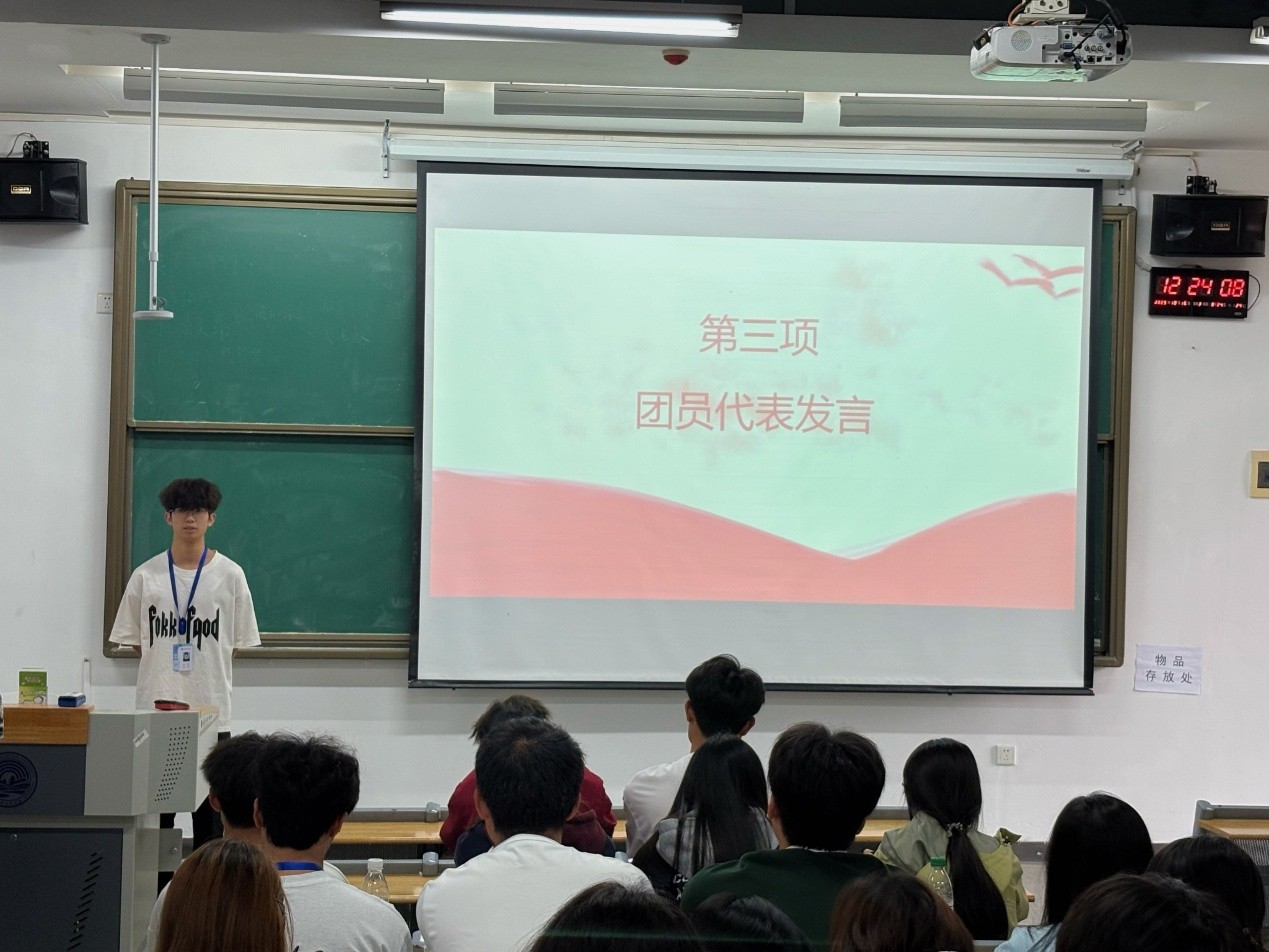 大会第二项,团干代表朱正轩上台分享。结合“九三阅兵”观看感受,他号召同学们将爱国信念转化为实际行动,在校园服务乡村实践等阵地主动作为,以阅兵精神为青春奋斗注入动力。