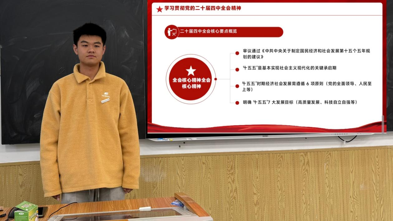 主题学习环节,校学生会执行主席沈楚晗通过“政策解读 + 青年关联” 的方式,让理论学习更具针对性与感染力。带领同学们系统学习了全会审议通过的《中共中央关于制定国民经济和社会发展第十五个五年规划的建议》,聚焦大学生群体,从“参与科创竞赛助力科技自立自强”、“投身‘三下乡’服务乡村振兴”到“锤炼新质生产力相关技能赋能就业创业”、“传承传统文化筑牢文化自信”,逐一解锁国家发展与青年成长的紧密关联,让每位成员都明确了“小我”融入“大我”的奋斗方向。