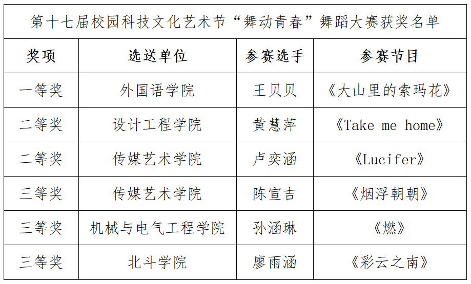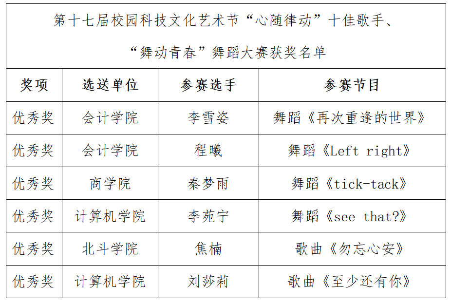 (“心随律动”十佳歌手大赛、“舞动青春”舞蹈大赛优秀奖)