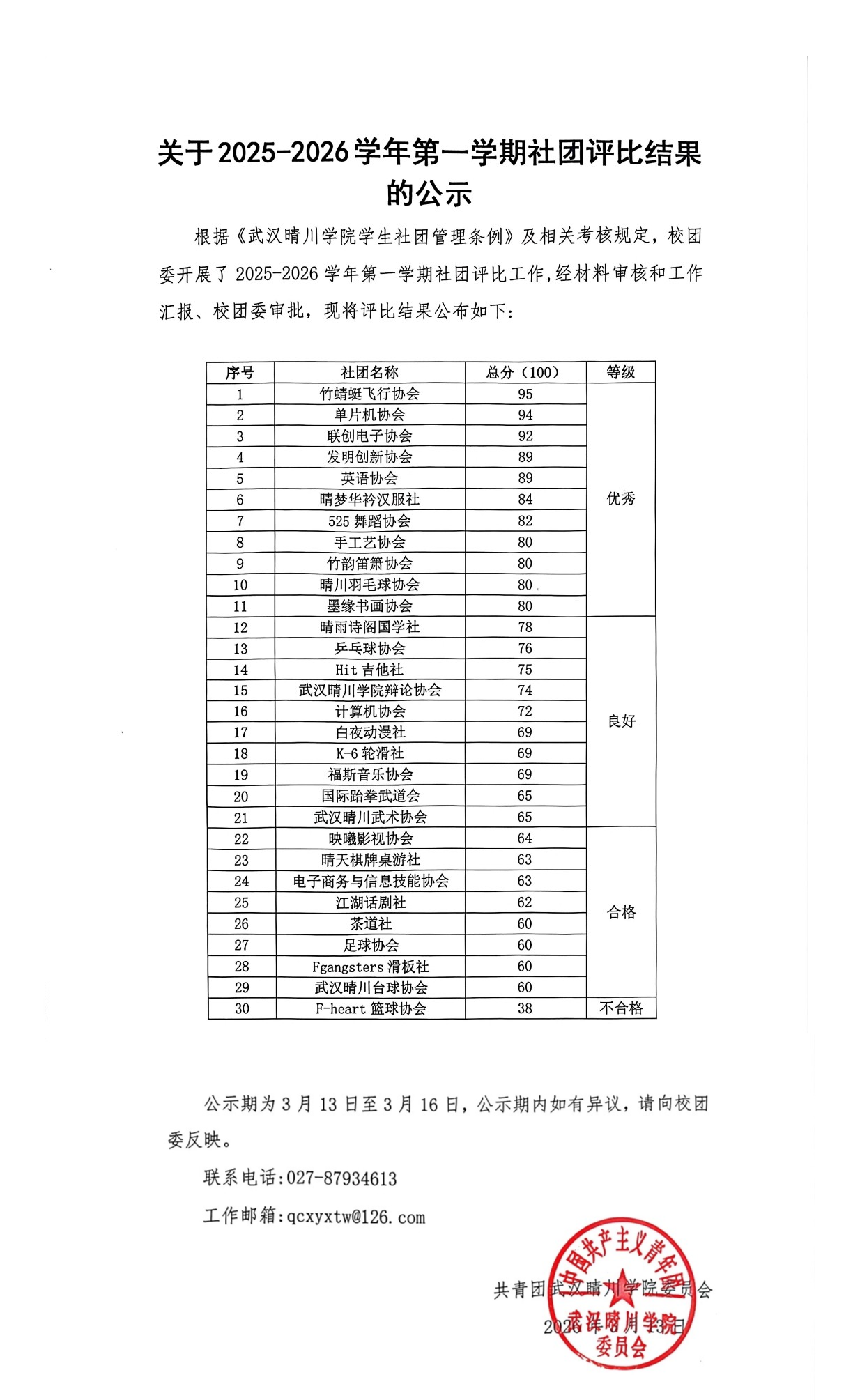 本次评审严格遵循“公平、公正、公开”的基本原则,坚持高标准、严要求进行综合考核。最终,经过严格审核,共有11个社团获评“优秀”等次,10个社团获评“良好”等次,8个社团获评“合格”等次,另有1个社团被评为“不合格”等次。